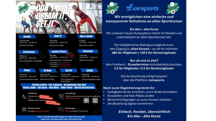 Vergleichbar mit der sehr erfolgreichen Kooperation im Kinderturnteam haben der TSV und der FTSV Kuchen auch eine Kooperation im Gesundheits- & Freizeitsportbereich gegründet. Die Kooperation ist ein Sammelsurium aus den Abteilungen Gesundheitssport / Kursprogramm, Reha- und Behindertensport und Turnen & Freizeitsport.