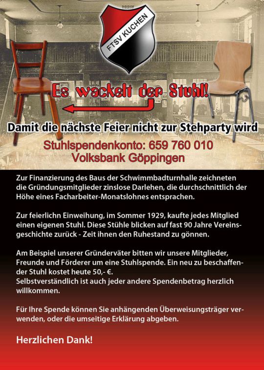 Am 17.09.16, 13.15 Uhr, war das historische Ziel erreicht. Das Projektteam durfte die Spende entgegen nehmen, mit der vollends alle Tische und Stühle finanziert werden konnten und das Darlehen der Gemeinde Kuchen komplett zurück bezahlt werden konnte. Ein Meilenstein in der Vereinsgeschichte war geschafft. Exakt 1 Jahr, 5 Monate und 10 Tage nach Eröffnung unseres Spendenkontos waren die Gesamtkosten von 26.748,29 € gedeckt. Wir sind allen Spenderinnen und Spendern, Unterstützern, Freunden, Sponsoren und Gönnern zu großem Dank verpflichtet. Gemeinsam haben wir ein Projekt gestemmt, von dessen Realisierung wir zwar geträumt haben, dessen Verwirklichung in dieser kurzen Zeit nicht zu erwarten war.